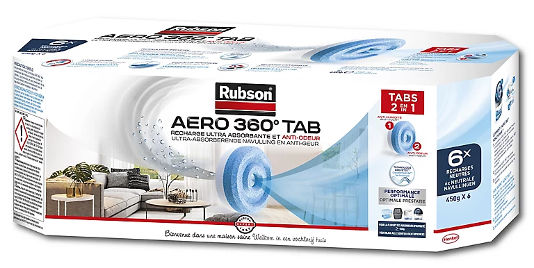 Un contrôle durable et efficace de l’humidité grâce à la recharge pour déshumidificateur Rubson AERO 360° Les tablettes ultra-absorbantes sont parfaites pour recharger votre absorbeur d’humidité AERO 360° afin d’assurer un contrôle durable et efficace de l’humidité ! Grâce à un système de circulation d’air à 360°, le déshumidificateur Rubson AERO 360° absorbe efficacement l’humidité pour créer un climat intérieur confortable et prévenir les problèmes d’humidité courants comme la condensation, les moisissures et les mauvaises odeurs. Doté d’une technologie innovante 2 en 1, les tabs permettent non seulement de réduire l’excès d’humidité, mais aussi de neutraliser les odeurs. Elles transforment l’humidité en eau, la première goutte apparaît après seulement 12 heures. Les tablettes contiennent des agents anti-odeurs brevetés qui capturent et neutralisent les mauvaises odeurs par réaction chimique. Ces tabs sont compatibles avec la plupart des absorbeurs d’humidité se rechargeant avec une recharge d’au moins 450 g. Pour l’utiliser : 1. Appuyez sur le bouton ‘OUVRIR’ de l’absorbeur AERO 360° standard ou les boutons poussoirs de l’AERO 360°. 2. Ouvrez le sachet de la tablette Rubson. 3. Placez la tab face bleue vers le bas et fermez l’appareil. 4. Lorsque le niveau d’eau accumulé dans le réservoir atteint la zone rouge de l’indicateur, ouvrez le bouchon et videz l’eau dans les WC. Le déshumidificateur AERO 360° dispose également d’un système anti-renversement, les clips de sécurité empêchent l’ouverture inopinée de l’appareil. Les caractéristiques du produit en détail : 2 en 1 : Contrôle l’humidité et neutralise les odeurs de moisi Composé de cristaux ultra-actifs pour une haute absorption de l’humidité Technologie anti-odeur et design ondulé brevetés Efficace et rapide : la première goutte apparaît seulement après 12 heures Dure jusqu’à 3 mois dans une pièce de 20 m²* *Dépend du niveau d’humidité, de la température de la pièce et de l’appareil AERO.