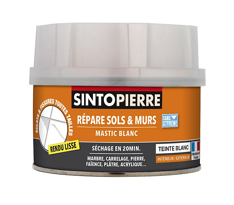 Le mastic polyester Sintopierre reconstruit et répare tous types de pierres et marbres. Existe en 5 coloris (noir, blanc, rouge, gris, travertin) et 2 conditionnements (tube blister et boite).
