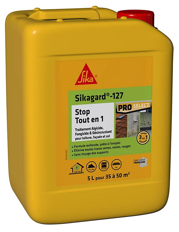 | Conseils d'utilisation | Sikagard®-127 Stop TOUT en 1 a une double fonction : Traitement des supports contre les traces vertes, noires, rouges, brunes, les algues, les lichens blancs, jaunes… Désincrustant de surface contre les traces grises et l'encrassement superficiel des supports. Sikagard®-127 Stop TOUT en 1 est particulièrement destiné au traitement des: -Toitures -Façades -Sols |
